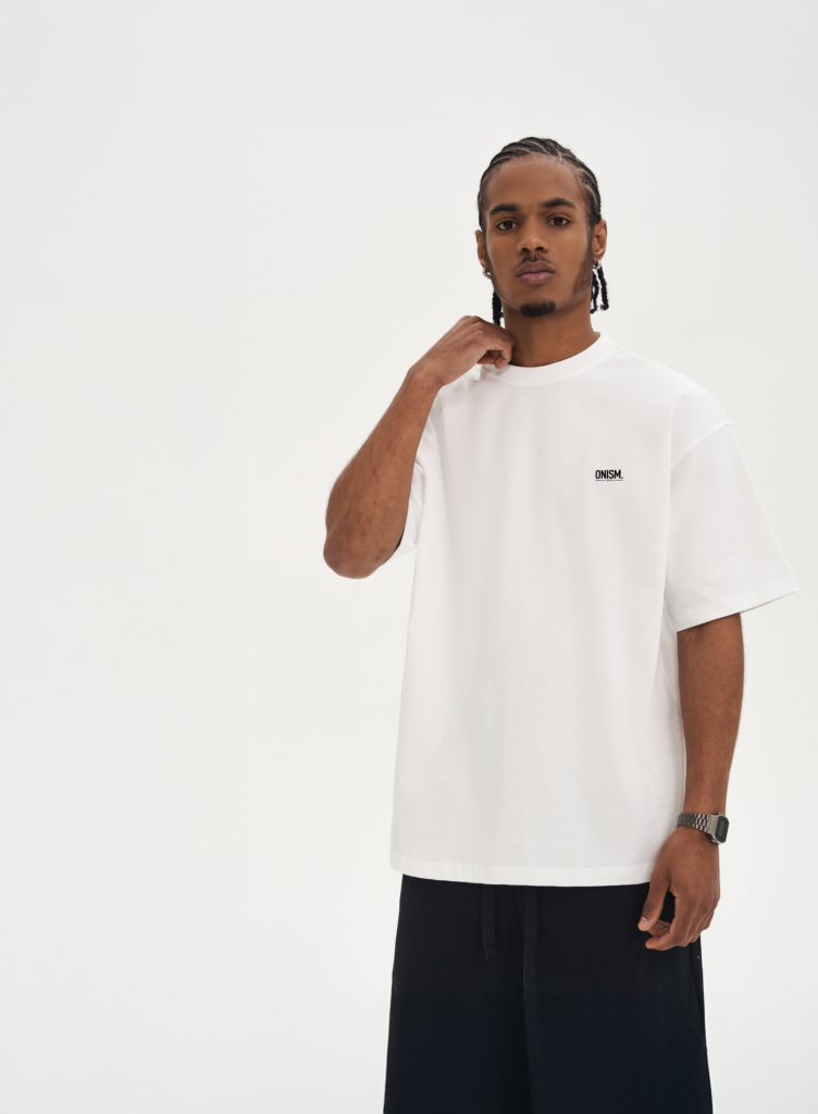 Two models wearing ONISM Studio T-shirts — one in black with a graphic print reading ‘I think there’s a flaw in my code,’ and one in white with a minimalist ONISM logo — promoting the new collection.